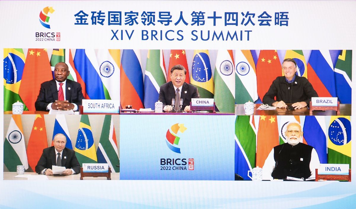 6月23日晚,中国国家主席习近平在北京以视频方式主持金砖国家领导人第十四次会晤,南非总统拉马福萨、巴西总统博索纳罗、俄罗斯总统普京、印度总理莫迪出席。五国领导人围绕“构建高质量伙伴关系 共创全球发展新时代”的主题,就深化金砖合作、坚持多边主义、促进世界经济复苏、共同防控疫情、反对单边经济制裁和“长臂管辖”、加强人文交流等共同关心的问题达成许多重要共识。会晤通过并发表了《金砖国家领导人第十四次会晤北京宣言》。