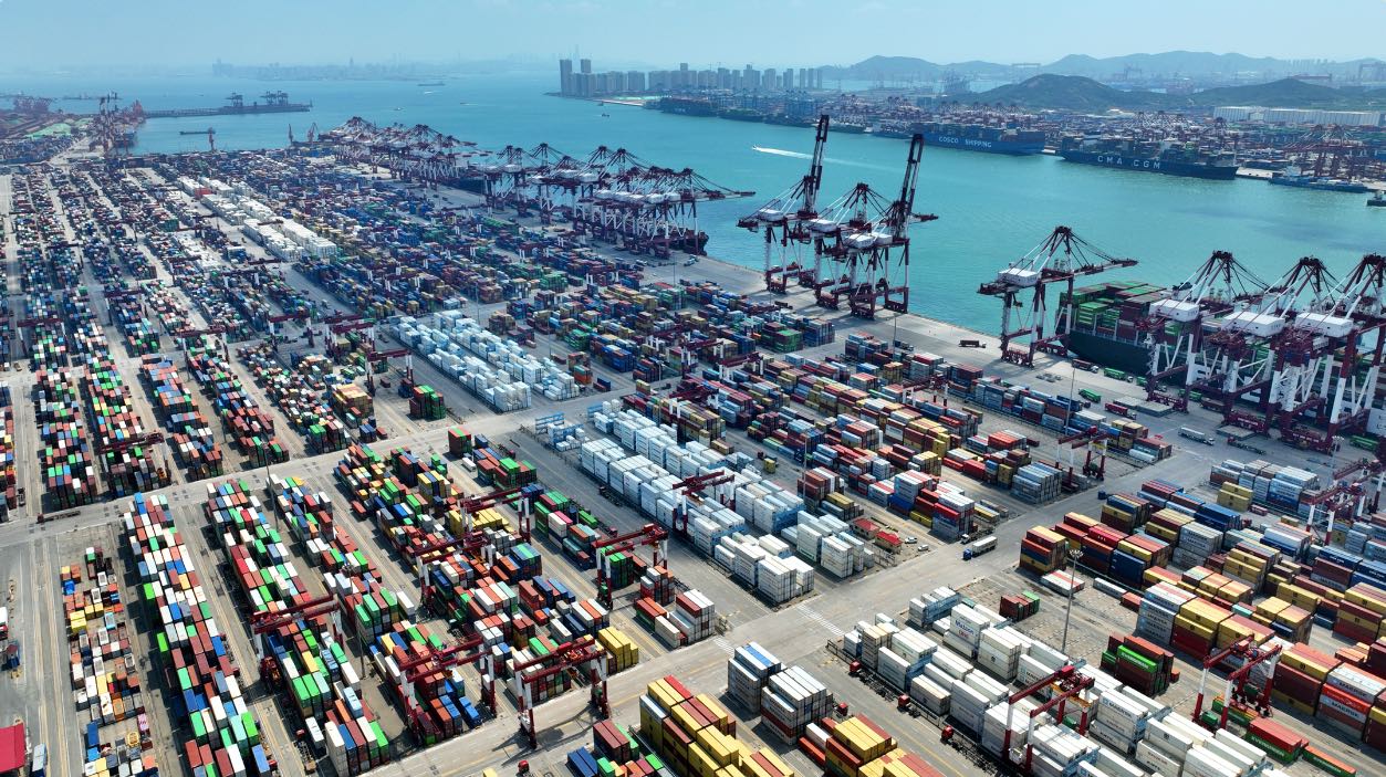 6月15日,山东青岛,繁忙的青岛港前湾港区。青岛海关的数据显示,今年1月至5月,青岛直达金砖国家的航线共完成进出口箱量83万标箱,同比增长12%。