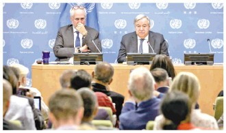 图为联合国秘书长古特雷斯(右)就气候变化问题出席记者会。人民视觉 供图