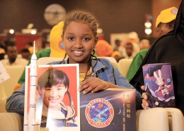 9月6日,在索马里首都摩加迪沙的“天宫对话”活动索马里分会场,当地学生展示活动纪念品。新华社发(扎卡里亚摄)