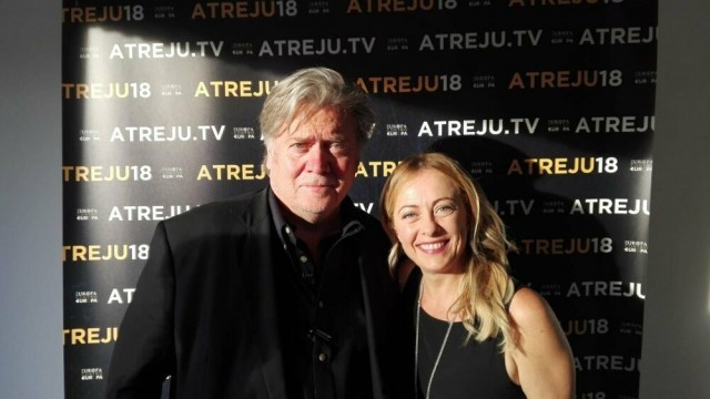 班农2018年出席意大利兄弟党青年分支活动时与梅洛尼合影