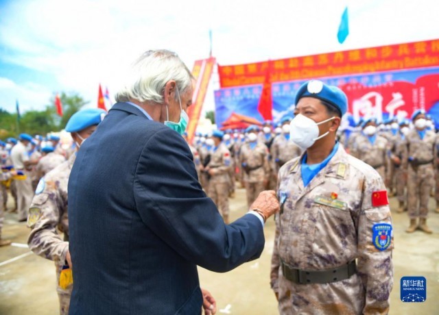 授勋仪式上,海瑟姆高度评价中国军人在执行各项授权任务中的表现,称赞他们充分展示了中国军人良好形象,体现了联合国维和人员牺牲奉献和廉正专业精神。