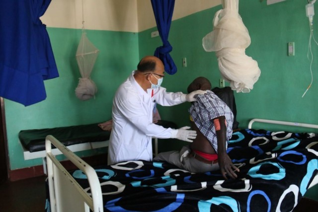 9月23日,在卢旺达东方省基本戈医院,中国第22批援卢旺达医疗队队员李俊升为患者做检查。新华社发(黄万晴摄)