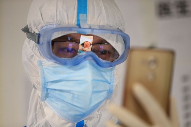 2020年3月18日,武汉市华中科技大学附属同济医院中法新城院区,一名从河南来支援的医生在进入病区前翻看手机上儿子的照片。他出发时,儿子还未出生。 图片来源视觉中国