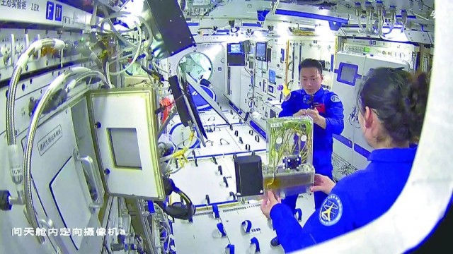 2022年10月12日,“天宫课堂”第三课在中国空间站开讲。图为航天员现场展示水稻“吐水现象”。(图片来源:视觉中国)