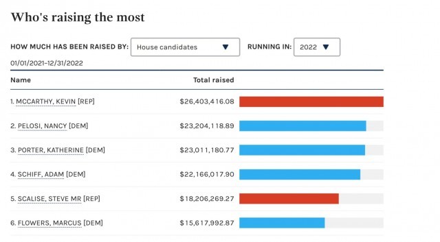 联邦竞选委员会网站上,众议院候选人筹资排名中,麦卡锡名列第一