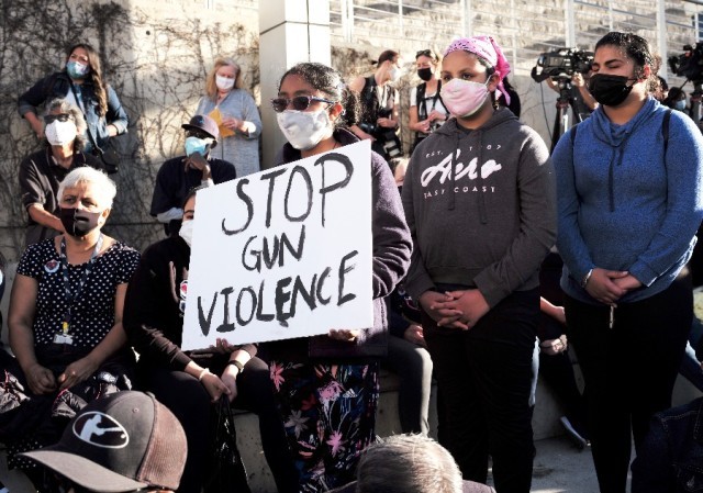 2021年5月27日,人们手举“停止枪支暴力”的标语在美国加利福尼亚州圣何塞市政厅广场参加仪式,悼念该市前一天发生的严重枪击事件中的死者。(新华社记者吴晓凌摄)