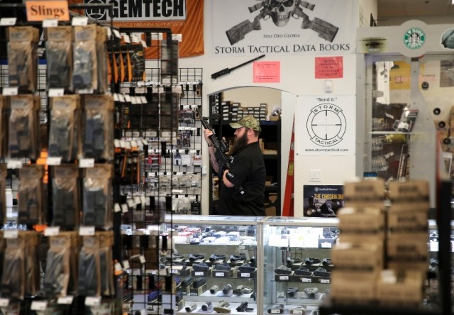 2017年10月4日,在美国拉斯维加斯的一家枪械商店,一名店员为顾客展示枪支。(新华社记者王迎摄)