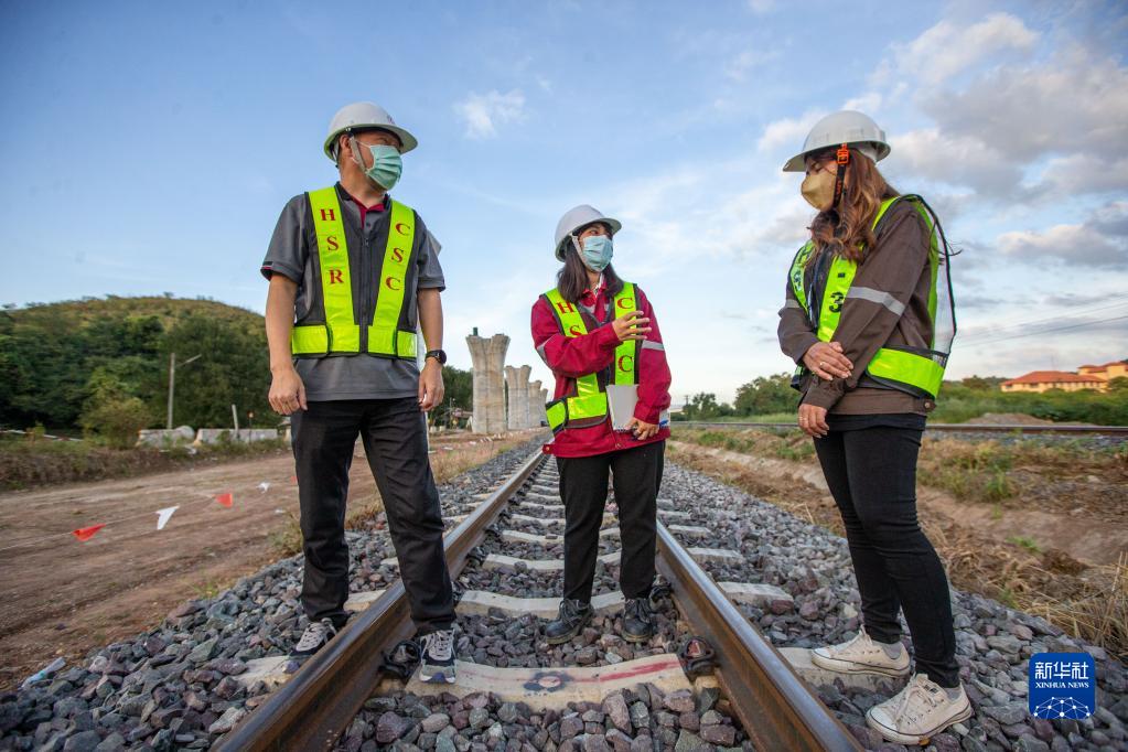 11月10日,泰国女孩潘纳洛(中)在呵叻府中泰铁路建设现场工作。新华社记者王腾摄
