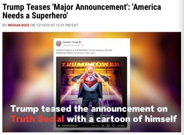 美国前总统特朗普14日发布一段超级英雄主题的视频,预告次日将有“重大宣布”。图片来源:美国《新闻周刊》报道截图