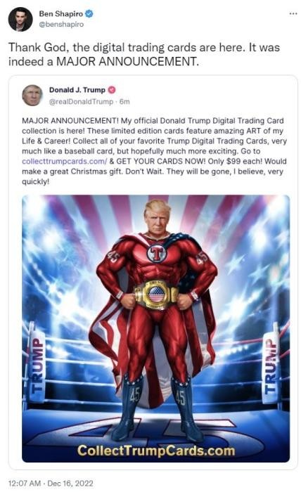 保守派媒体Daily Wire创始人夏皮罗 (Ben Shapiro) 在一条推文中讽刺道:“感谢上帝,数字交易卡终于推出了。这确实是一个重大公告。”