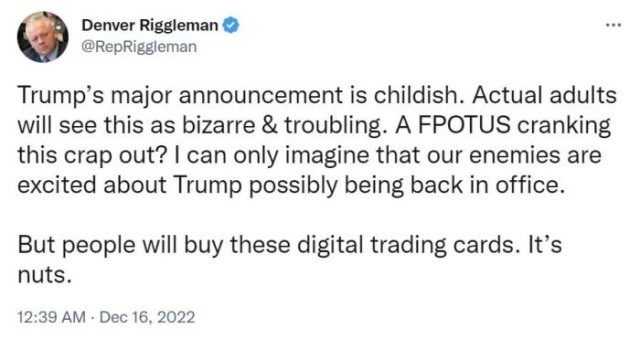 前维吉尼亚州共和党国会众议员里格尔曼(Denver Riggleman)在推特上写道:“特朗普的重大声明很幼稚。真正的成年人会觉得这很奇怪,让人堪忧。美国前总统搞这种破事?我都能想象我们的敌人会对特朗普可能重新执政感到多兴奋。”