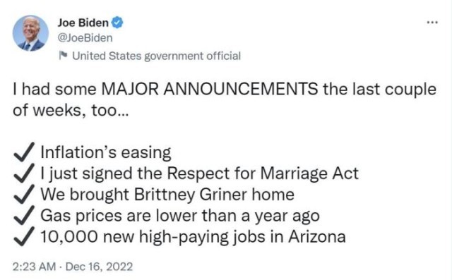 美国现任总统拜登也在推特上发文讽刺,称他“过去几周也有一些重大声明”,包括“缓解通胀”“油价比一年前更低”“在亚利桑那州增加了1万个高薪就业岗位”等“成绩”。
