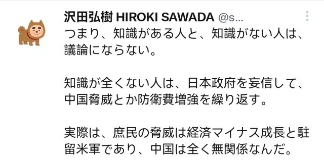 网友@HIROKI表示,总之,有知识的人是不会和没有知识的人争论的。完全没有知识的人才会盲目信任日本政府反复渲染的中国威胁。事实上,真正对老百姓构成威胁的是经济负增长和驻日美军,与中国完全没有关系。
