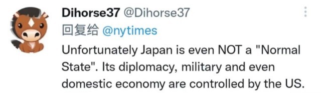 网友@Dihorse37表示,不幸的是,日本甚至不是一个“正常国家”。它的外交、军事甚至国内经济都由美国控制。
