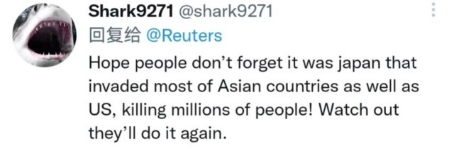 网友@Shark9271表示,希望人们不要忘记是日本入侵了亚洲国家,并杀害了很多人!小心他们会再次这样做。