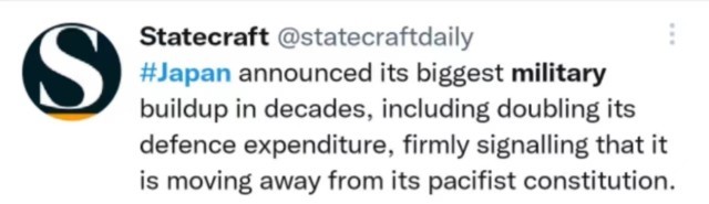 网友@statecraftdaily表示,日本宣布了数十年来最大规模的军事建设,包括要将国防开支增加一倍,这表明日本正在背离其和平宪法。