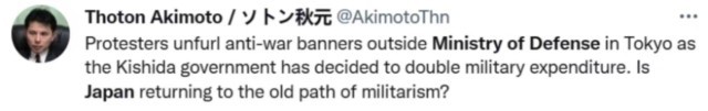 网友@AkimotoThn表示,抗议者在位于东京的防卫省外拉开反战横幅,因为岸田政府已决定将军费开支增加一倍。日本是否回到了军国主义的老路上?