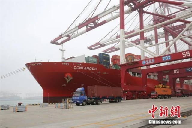 来自韩国釜山的中海安第斯号货轮在青岛前湾保税港区码头卸货。张进刚 摄