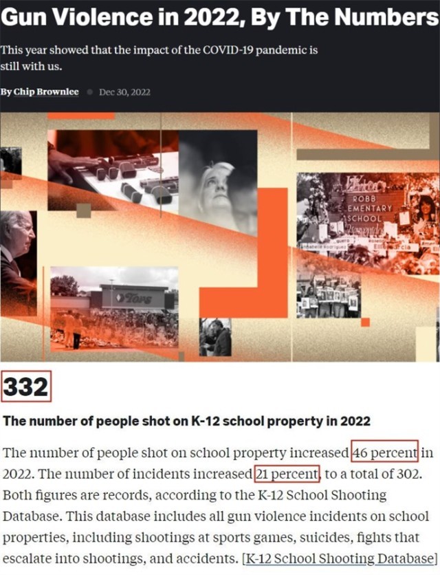 2022年,全美中小学(K-12学校)发生的校园枪击案达到302起;蓄意枪击事件和意外枪击事件分别增加了46%和21%,双双创下历史纪录。