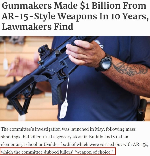 美国国会众议院监督与改革委员会去年公布的调查报告显示,随着过去十年枪支暴力事件的激增,美国五大主要枪支制造商仅靠销售AR-15型半自动步枪就获利超过10亿美元。
