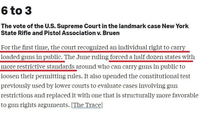 更为讽刺的是,就在这项“控枪法案”通过前仅两小时,保守派法官占多数的美国联邦最高法院推翻了纽约州已经实施百年的限制民众在外隐蔽携枪的法律,使各州和地方政府监管枪支的能力受到严重限制。