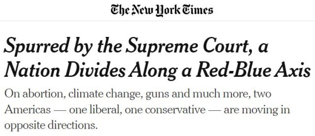 《纽约时报》评论称,在最高法院的推动下,“两个美国”正在以红色(代表共和党)和蓝色(代表民主党)为界,朝着相反的方向发展。