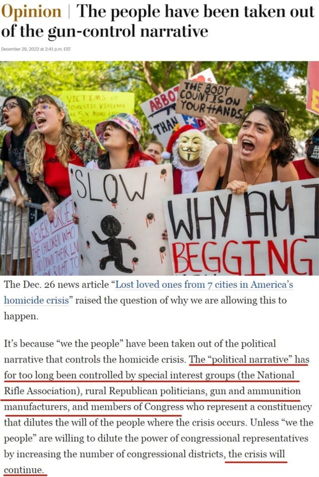 《华盛顿邮报》刊文指出,长期以来,有关枪支的“政治叙事”一直被美国全国步枪协会(NRA)所代表的特殊利益集团、保守派政客、枪支制造商所控制。除非美国民众愿意通过增加国会选区数量来削弱国会议员的权力,否则枪支暴力危机将无限期继续下去。