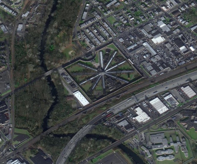 图为2021年拍摄的美国费城霍姆斯伯格监狱的卫星遥感影像。