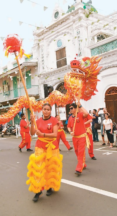 2月3日,在毛里求斯首都路易港“欢乐春节”活动现场拍摄的舞龙表演。