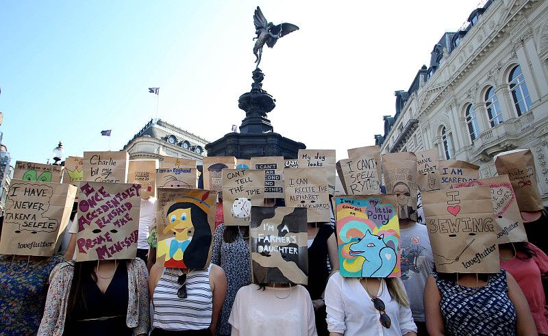 英国伦敦,人们头戴写着个人信息的纸袋,在街头宣传一款新的交友软件。图片来源 视觉中国