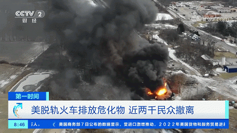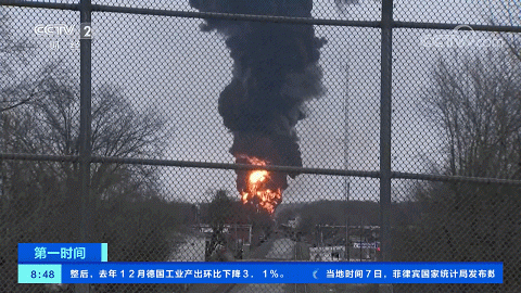 当地时间2月3日晚,一列运载有毒化学品的列车在美国俄亥俄州东部脱轨,引发大火。