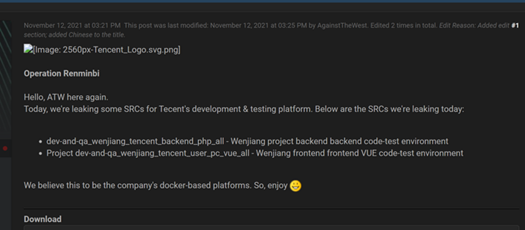 2021年10月14日,ATW在“阵列论坛”(RaidForums)发布题为“人民币行动(Operation Renminbi)”的帖子,称“出售中国人民银行相关软件项目源代码”。