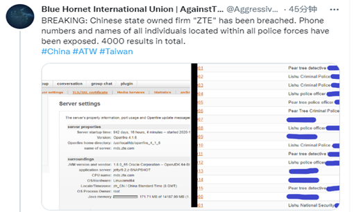 2022年8月12日,ATW组织在推特发布数据售卖帖,称其从中兴通讯公司服务器获取了4000条警察人员的电话号码和姓名数据。