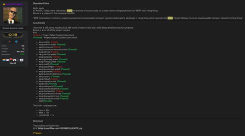 2022年8月16日,ATW组织通过Breached黑客论坛公布港铁系统源码文件,内容涉及香港铁路公司的交易、排程等26个系统项目代码。