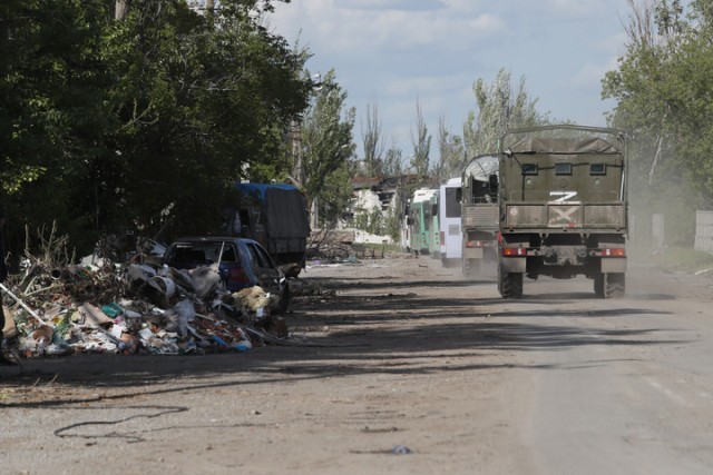 2022年5月20日,载着乌克兰武装人员的巴士驶离马里乌波尔。俄罗斯国防部发言人科纳申科夫当天说,俄武装部队已经完全控制马里乌波尔亚速钢铁厂的地下设施。新华社发(维克托摄)