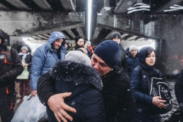 2022年3月8日,一对情侣在乌克兰伊尔平告别。俄罗斯国防部当天表示,俄军自莫斯科时间3月9日10时起再次启动“安静模式”,以保障从基辅、切尔尼戈夫、苏梅、哈尔科夫和马里乌波尔撤离平民的人道主义走廊。新华社发(迭戈·埃雷拉摄)
