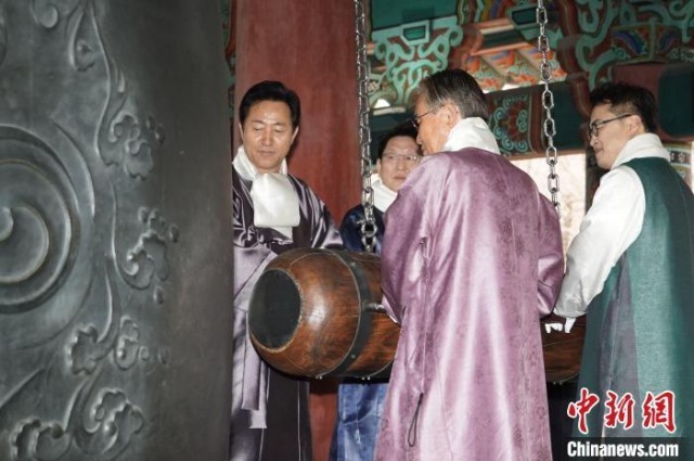 当地时间3月1日,韩国首尔市政府在普信阁举办敲钟仪式,纪念“三一运动”104周年。