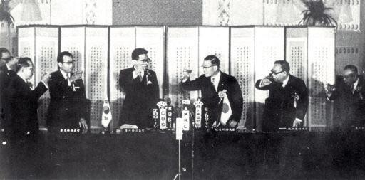 资料图:1965年12月18日,韩国外务长官李东元和日本外相椎名悦三郎在政府办公楼长官室庆祝《韩日请求权协定》生效。图片来源:《韩民族日报》