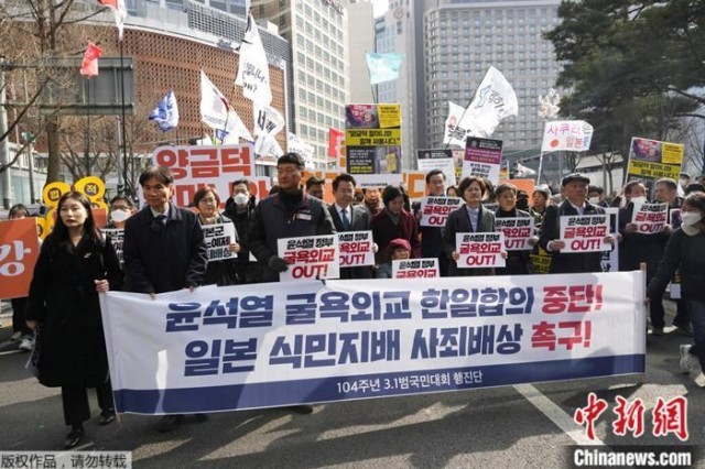2023年3月1日,韩国民众在首尔日本驻韩大使馆附近集会,举着写有“中断屈辱外交韩日协议”等口号的抗议横幅。