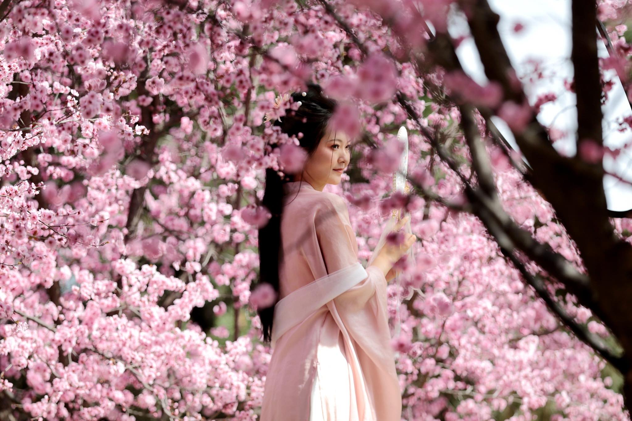 3月14日,中国陕西省西安市,大明宫国家遗址公园内繁花似锦,市民穿着汉服在花下留影。