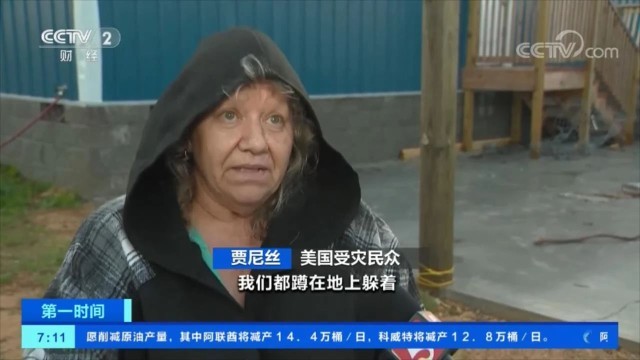 美国受灾民众 贾尼丝:我们都蹲在地上躲着,因为所有的门都被卷走了,前面的两扇门,后面的两扇门,还有所有窗户上的玻璃,都在一瞬间就被卷走了。
