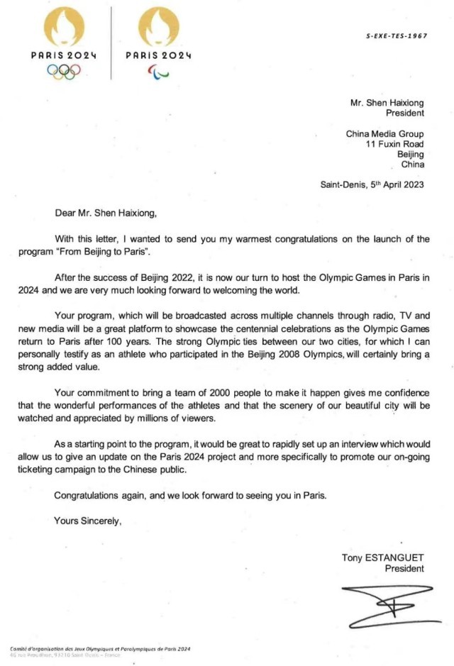 在法国总统马克龙对中国进行国事访问之际,2024巴黎奥运会组织委员会和巴黎残奥运会组织委员会主席托尼·埃斯坦盖致函中央广播电视总台台长,祝贺总台“从北京到巴黎”融媒体活动启动。