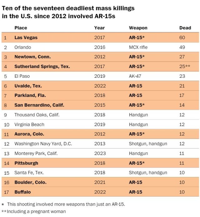 据《华盛顿邮报》最新统计,自2012年康涅狄格州纽敦市桑迪胡克小学枪击案至今,美国17起最致命的大规模枪击案中有10起涉及AR-15。