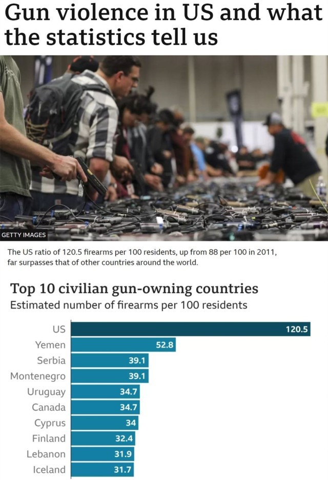 作为世界上民间拥枪率最高的国家,美国流通枪支总量估计多达3.9亿支,相当于每100人拥有120.5支枪。
