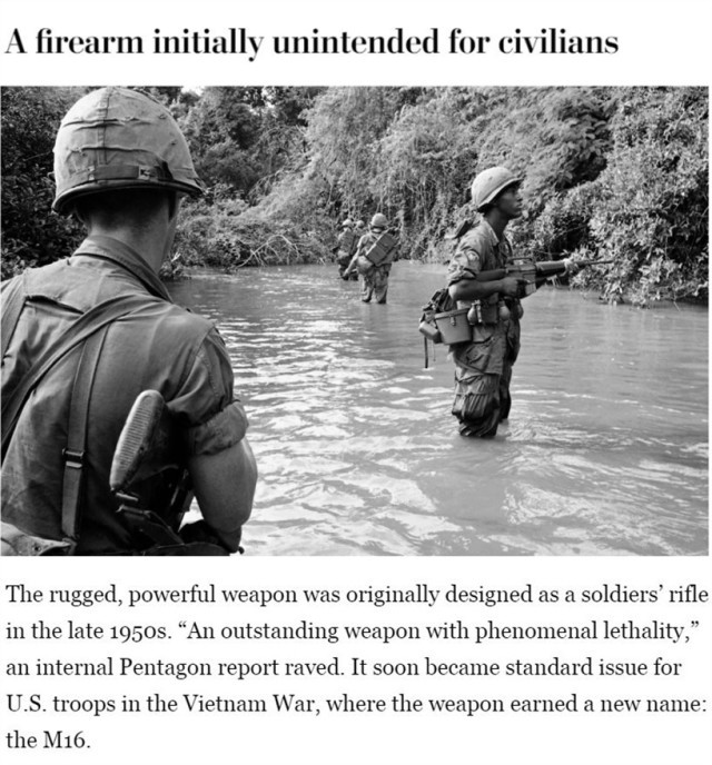 在上世纪60年代的越南战争中,AR-15成为美国军队的标配,并被命名为很多人耳熟能详的M-16。美国国防部曾在一份内部报告中将其称赞为“一种具有惊人杀伤力的杰出武器”。