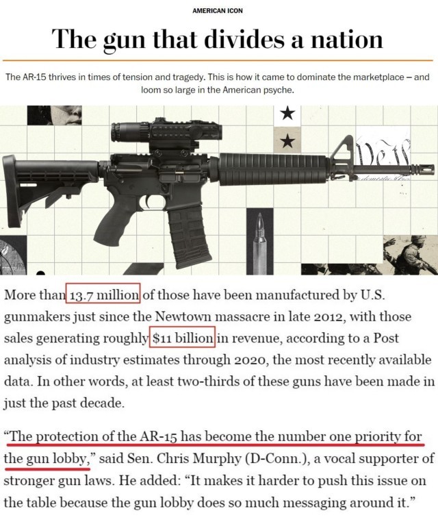 用民主党籍参议员克里斯·墨菲的话说,“保护AR-15已经成为枪支游说团体的首要任务”,“这使得把(禁止攻击性武器)这个问题摆上桌面变得更加困难”。