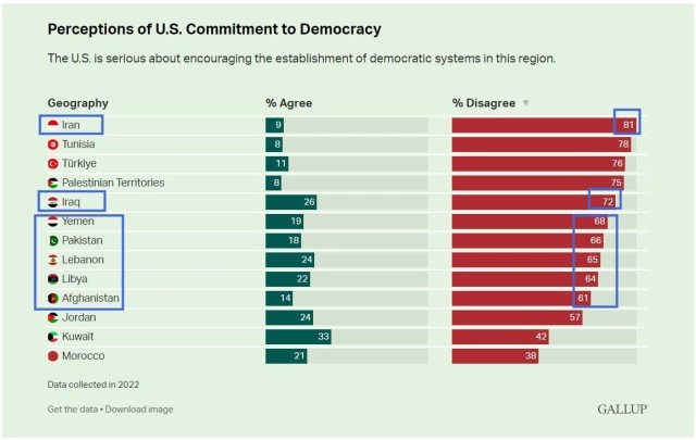 盖洛普咨询公司近日发布的一项面向伊拉克等13个穆斯林人口占多数的国家的最新民调显示,美国发动伊拉克战争20年后,这些国家的大多数民众认为,美国干涉该地区并不是真的为了推进民主。