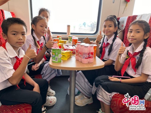 “第一次坐火车,好快啊。以后我要好好学中文,争取早点去北京。” 农冰村小学的学生英提达看着车窗外的风景说,能在老挝新年假期坐火车去琅勃拉邦旅游,感到非常激动。