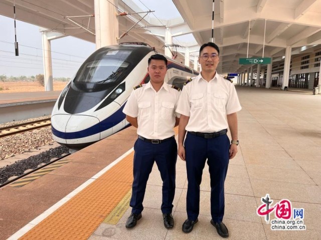 中老铁路国际旅客列车首发车D888次司机刘银能和邬俊鸿。中国网记者 唐佳蕾/摄